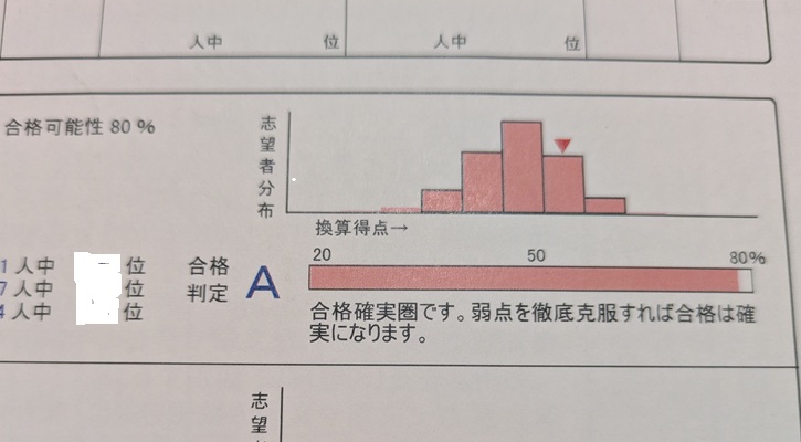分布図を見ると上位に位置しており、合格判定A(合格率80%)と記載されていました。